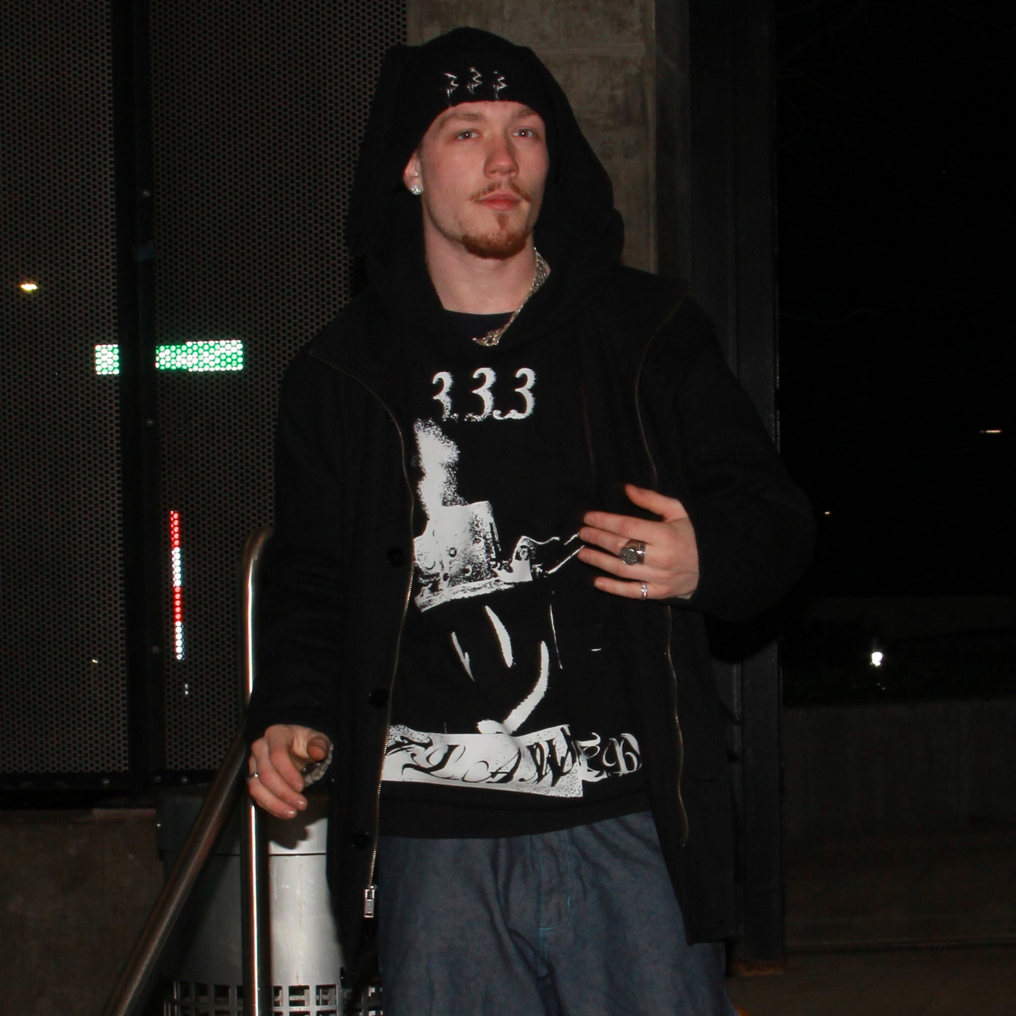The graphic contrasts polished metallic tones and warm flame hues against the deep black fabric, creating a sharp, striking visual. Ribbed cuffs, a thick waistband, and a double-lined hood add to the piece’s premium construction, while subtle distress detailing gives it that archived, lived-in energy.
